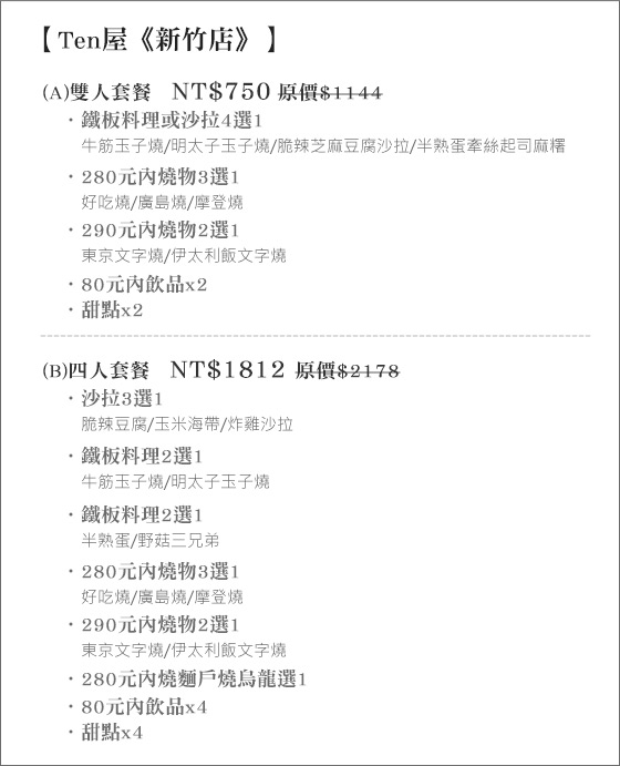 只要750元起即可享有【Ten屋《新竹店》】原價最高2,178元精選套餐:(A)雙人餐/(B)四人餐。